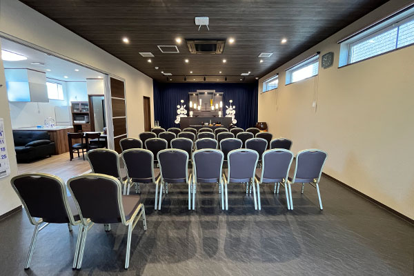 祭壇を備えた斎場のほか、家族控室・キッチン・洗面室・シャワー室・トイレ、大型バスも利用可能な駐車場などを完備。家族控室は、ソファとテーブルを備えた洋室と、休息いただける和室があります。